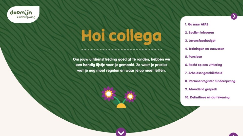 We zijn benieuwd hoe jij jouw loopbaan bij Doomijn hebt ervaren en wat wij daarvan kunnen leren. Daarom neemt onze HR-afdeling binnenkort contact met jou op om je een paar vragen te stellen.
