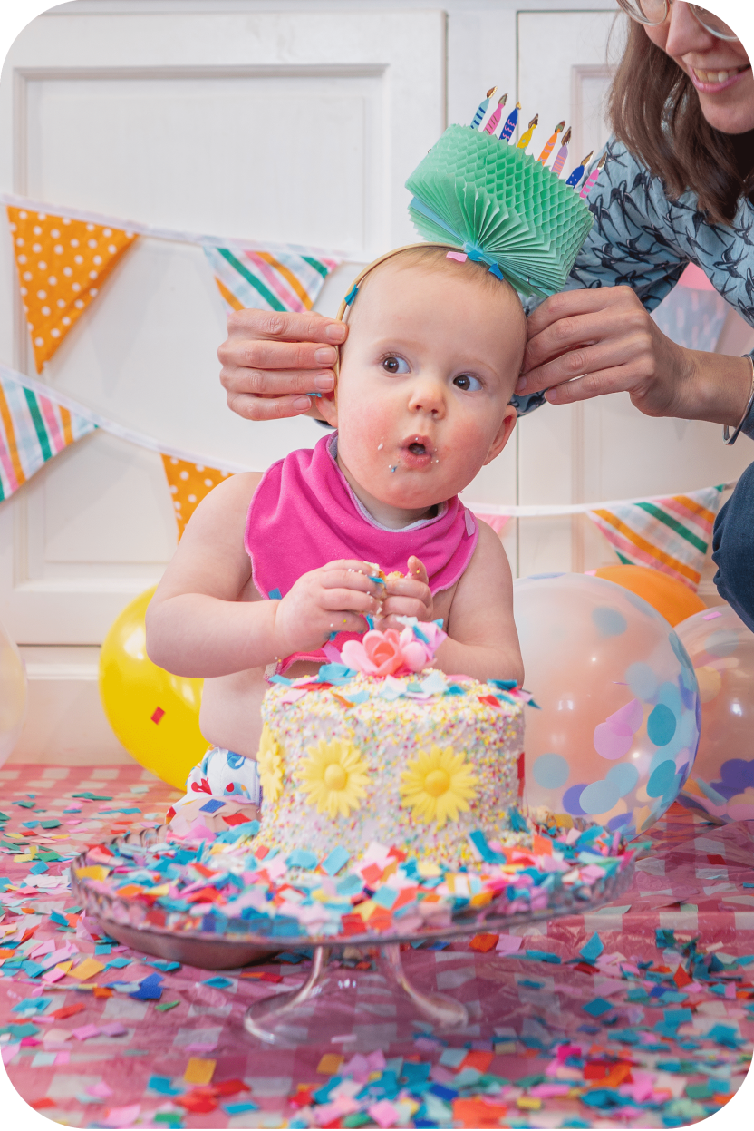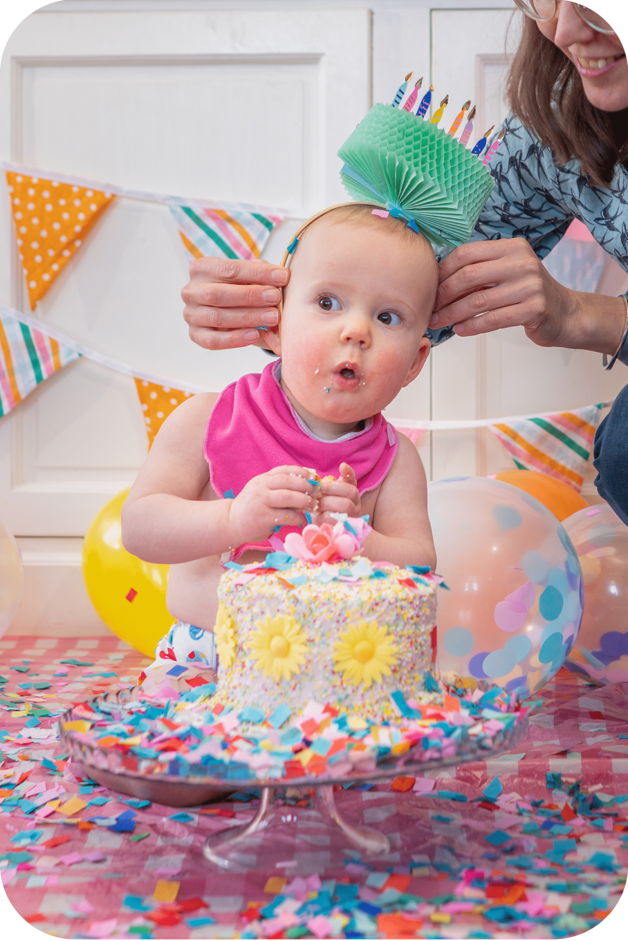 Het is mooi om te zien dat ieder kind zijn of haar eigen route volgt naar de mijlpaal van één jaar. Ik denk dat het meest belangrijke is om daarbij vooral je gevoel te volgen en je kind niet met andere kinderen te vergelijken. Elize haar eerste verjaardag vieren we met een ‘cake smash’: ik bakte een taart en Rick maakte de foto’s. Erg leuk! Al was Elize een beetje te keurig en smeerde ze niet met de taart. We hebben haar familie verspreid over drie weekenden uitgenodigd, Elize genoot van alle aandacht tijdens haar verjaardagsfeestjes.