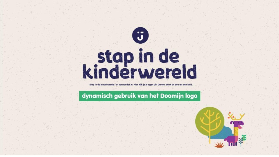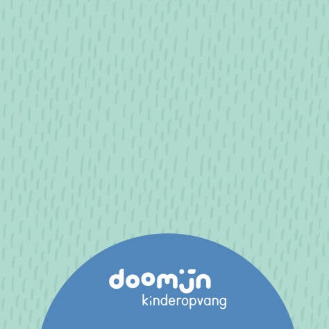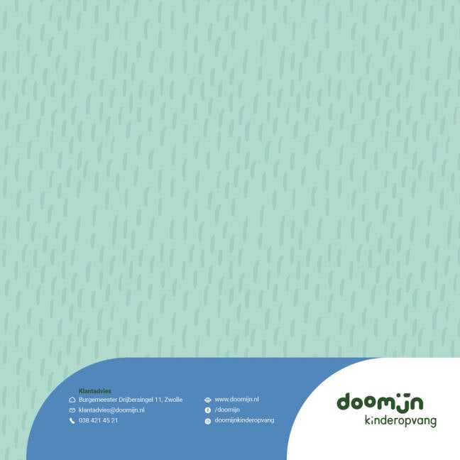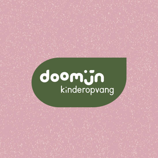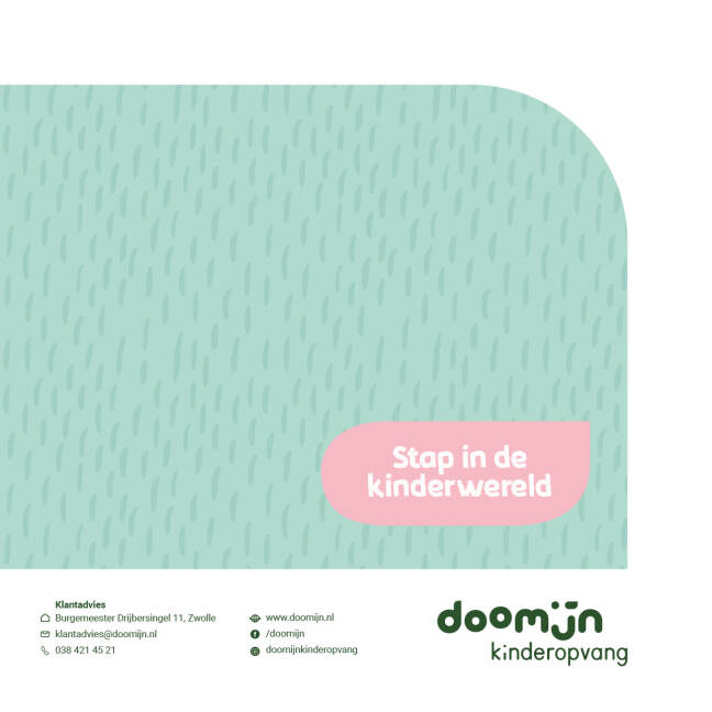Logo wordt in een afgerond vlak geplaatst. Dit vlak is altijd wit. De kleur van het Doomijn logo kan altijd verschillend zijn. De vorm achter het logo wordt doorgetrokken naar links en daar kan een call to action of de contactgegevens.