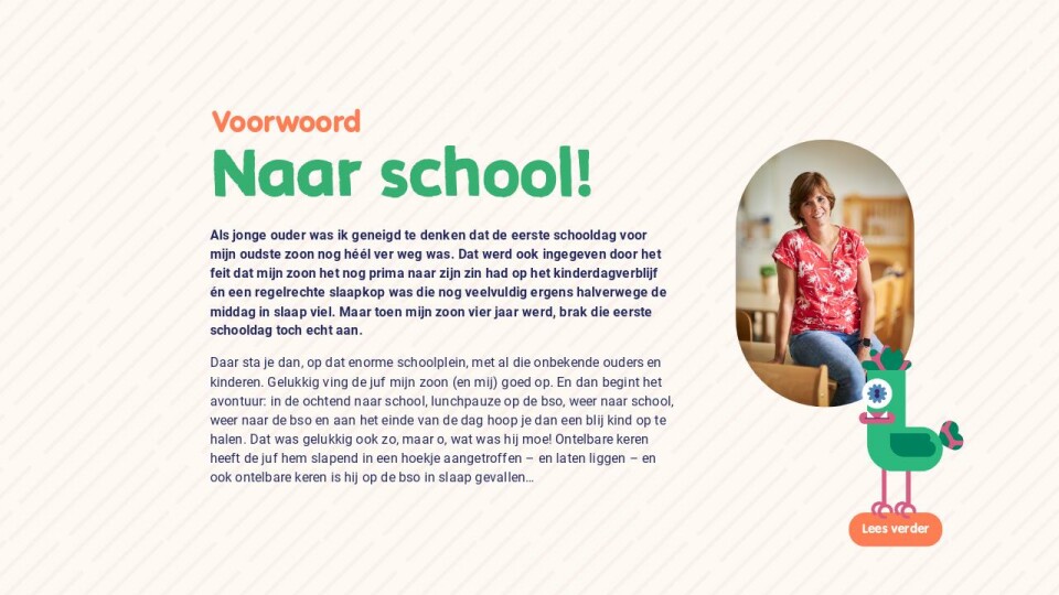 Met dit magazine nemen we je mee in de wereld van kleuters; van de eerste schooldag en een middag op de bso tot alles over de ontwikkelingen die jouw kind doormaakt. We bieden je hiermee wat handvaten om deze leuke – maar soms ook ingewikkelde – periode goed door te komen. Ik wens je veel leesplezier!