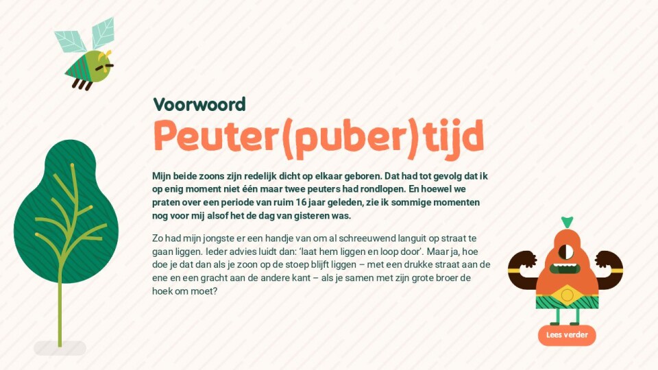 Ik denk dat iedere ouder van één of meerdere peuters wel te maken heeft met mooie én met moeilijke momenten. In dit magazine nemen we je mee in de wereld van een peuter en hopen we je wat extra handvaten te geven om deze mooie periode goed door te komen. Zo lees je over de taalontwikkeling van peuters, maak je de leukste gezonde traktaties, ontdek je over de ervaringen van kersverse én doorgewinterde medewerkers van de peuteropvang en dagen we je uit om een potje mee te spelen met het peuterganzenbord.