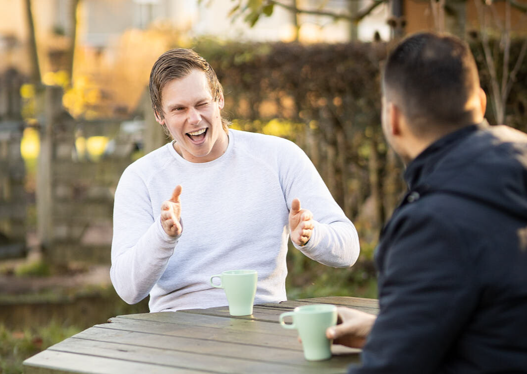 Mark (donker): ‘Nou, inderdaad, maar toen ze mij vroegen voor dit interview heb ik eigenlijk geen moment getwijfeld. Erg leuk dat we het samen eens kunnen hebben over verschillende onderwerpen zoals de kinderopvang, het groeien als ouder, maar ook het positieve van een mannelijke pedagogisch professional op de groep. En niet geheel onbelangrijk: nu kan ik hier ook even binnenkijken. Dat is natuurlijk ook anders nu in coronatijd. Dat ervaar jij vast ook wel.’