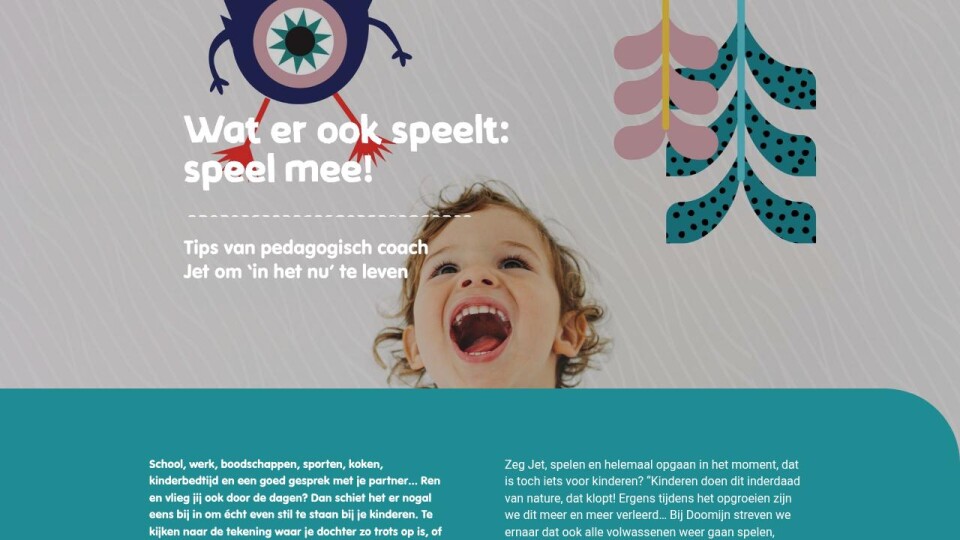 Zeg Jet, spelen en helemaal opgaan in het moment, dat is toch iets voor kinderen? “Kinderen doen dit inderdaad van nature, dat klopt! Ergens tijdens het opgroeien zijn we dit meer en meer verleerd… Bij Doomijn streven we ernaar dat ook alle volwassenen weer gaan spelen, omdat het zó goed werkt tegen stress en je er je batterij mee oplaadt. We nodigen iedereen uit: stap in de kinderwereld! En hoe leuk is het om dat samen met je kinderen te doen?” En dan is er die volle agenda en van alles dat nog moet gebeuren… Hoe dan? “Met twee zoons van vijf en drie jaar en een eenjarige dochter is dat bést een uitdaging! Hoe ik ervoor zorg dat de taken in huis gedaan zijn, mijn kinderen lekker spelen én ik zelf vaak mee kan spelen? Ik deel m’n beste tips met je:”
