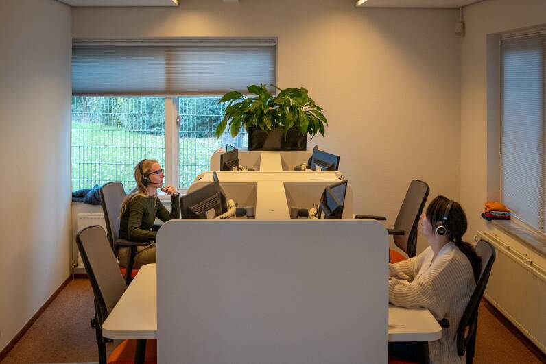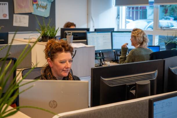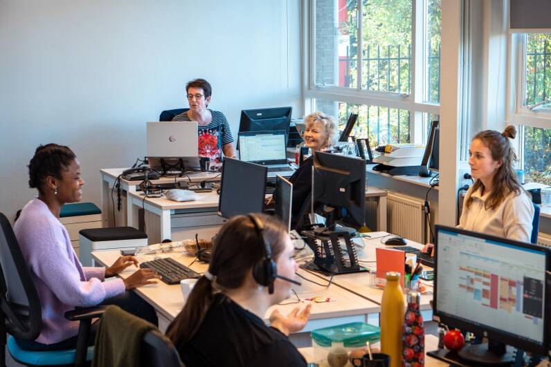 ‘Doomijn Klantadvies, wat kan ik voor je doen?’ Helemaal rechts achterin het pand zitten onze klantadviseurs klaar voor nieuwe en bestaande klanten. Ze zorgen ervoor dat kinderen op de kinderdagverblijven, peuteropvang en buitenschoolse opvang worden geplaatst en gaan in gesprek met ouders over hun vragen, tips of klachten.