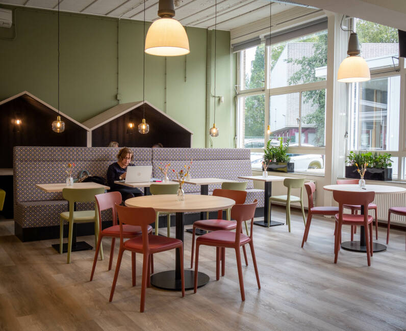 Iets verderop in de gang vind je de ontmoetingsruimte. Hier kun je gezellig zitten tijdens de lunch, een lekker bakje koffie halen of je even terugtrekken met je laptop als je iets wilt uitwerken of overleggen.