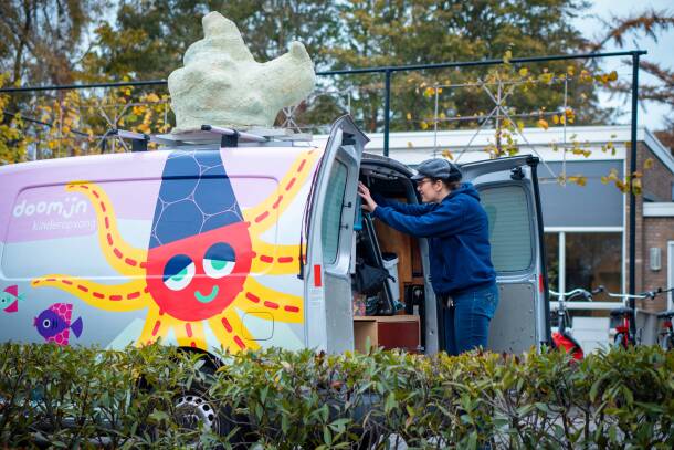 Met een auto vol nieuwe materialen kan Anjutta weer op pad. ‘Jut’ toert langs alle locaties van Doomijn én langs evenementen met De Verwonderhut. Deze kleurrijke caravan staat garant voor uren speel- en verwonderplezier! Buiten de caravan kunnen kinderen zich uitleven in het knutselen met losse en natuurlijke materialen: helemaal passend bij de visie van Doomijn.