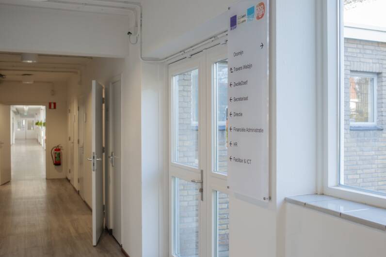 De meeste kantoren komen uit op deze lange gang. Rechts vind je twee afdelingen van Doomijn, namelijk Klantadvies en Management Ondersteuning (planning). Ook vind je hier de afdeling ICT. Aan de andere kant kom je van alles tegen: de kantoren van ZwolleDoet! en Travers Welzijn, maar bijvoorbeeld ook HR en de afdeling Pedagogiek, Kwaliteit en Ontwikkeling.