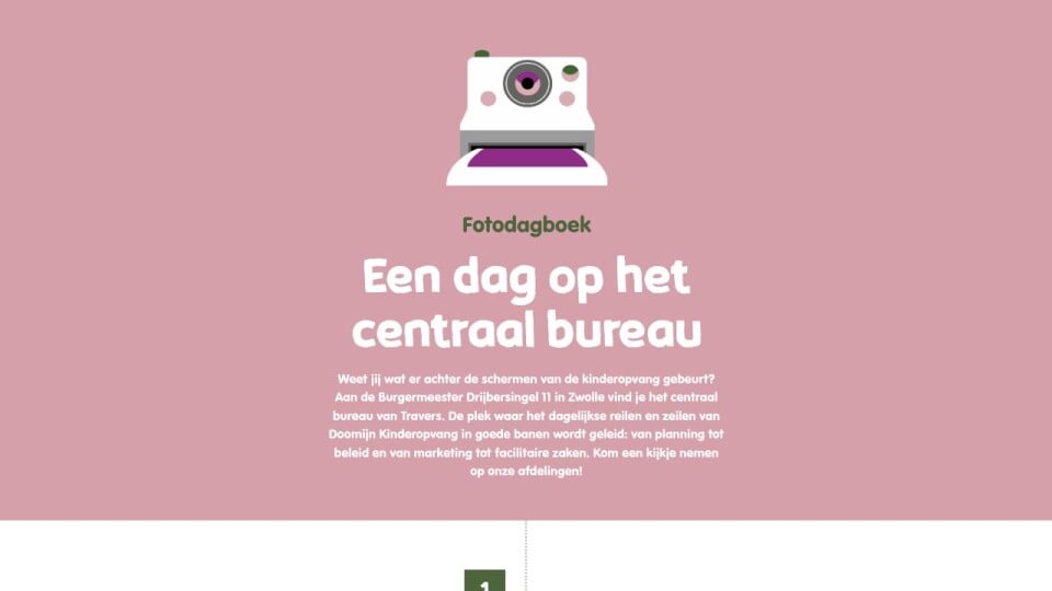 Weet jij wat er achter de schermen van de kinderopvang gebeurt? Aan de Burgermeester Drijbersingel 11 in Zwolle vind je het centraal bureau van Travers. De plek waar het dagelijkse reilen en zeilen van Doomijn Kinderopvang in goede banen wordt geleid: van planning tot beleid en van marketing tot facilitaire zaken. Kom een kijkje nemen op onze afdelingen!