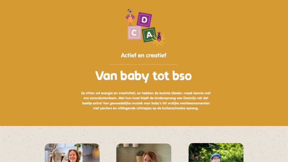 Ze zitten vol energie en creativiteit, en hebben de leukste ideeën: maak kennis met ons consulententeam. Met hun inzet biedt de kinderopvang van Doomijn nét dat beetje extra! Van gemoedelijke muziek voor baby’s tot vrolijke voorleesmomenten met peuters en uitdagende uitstapjes op de buitenschoolse opvang.